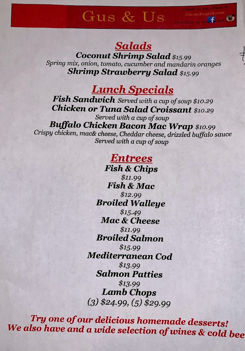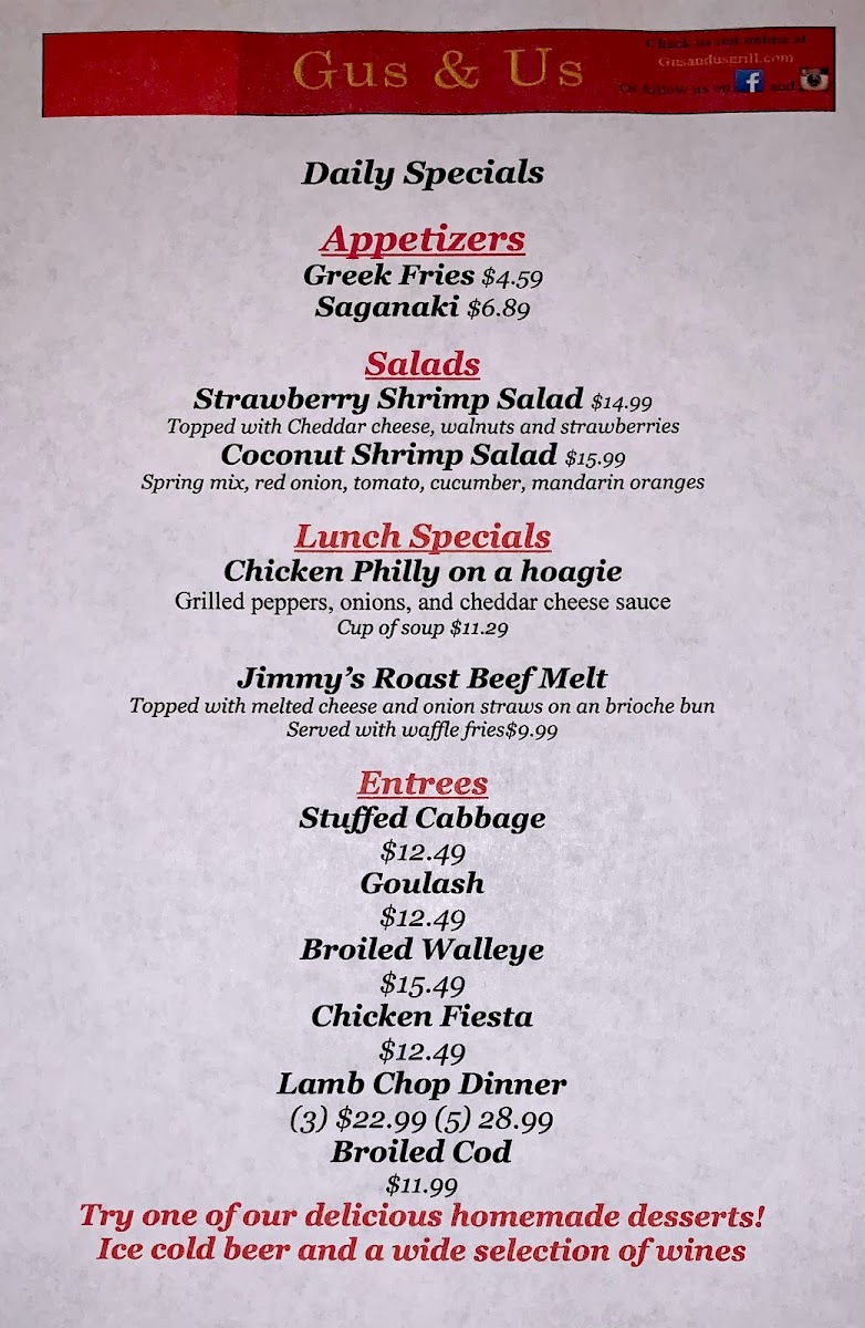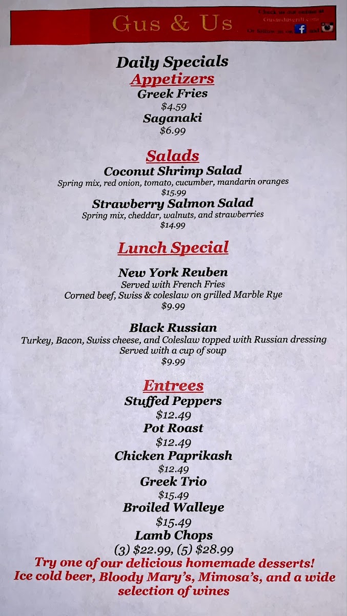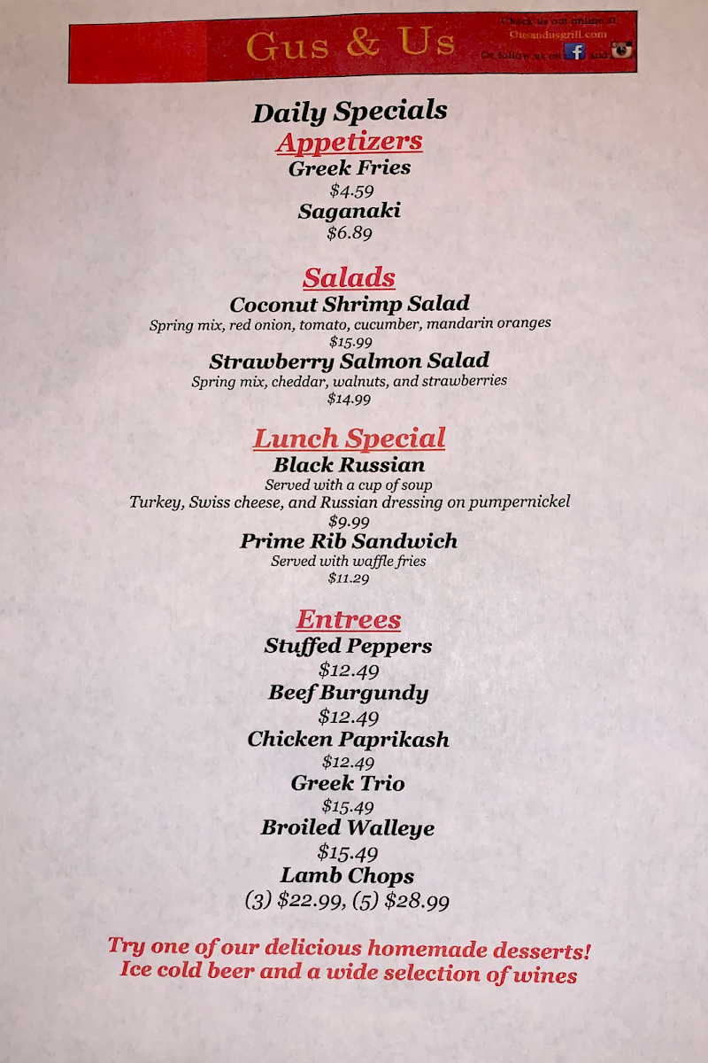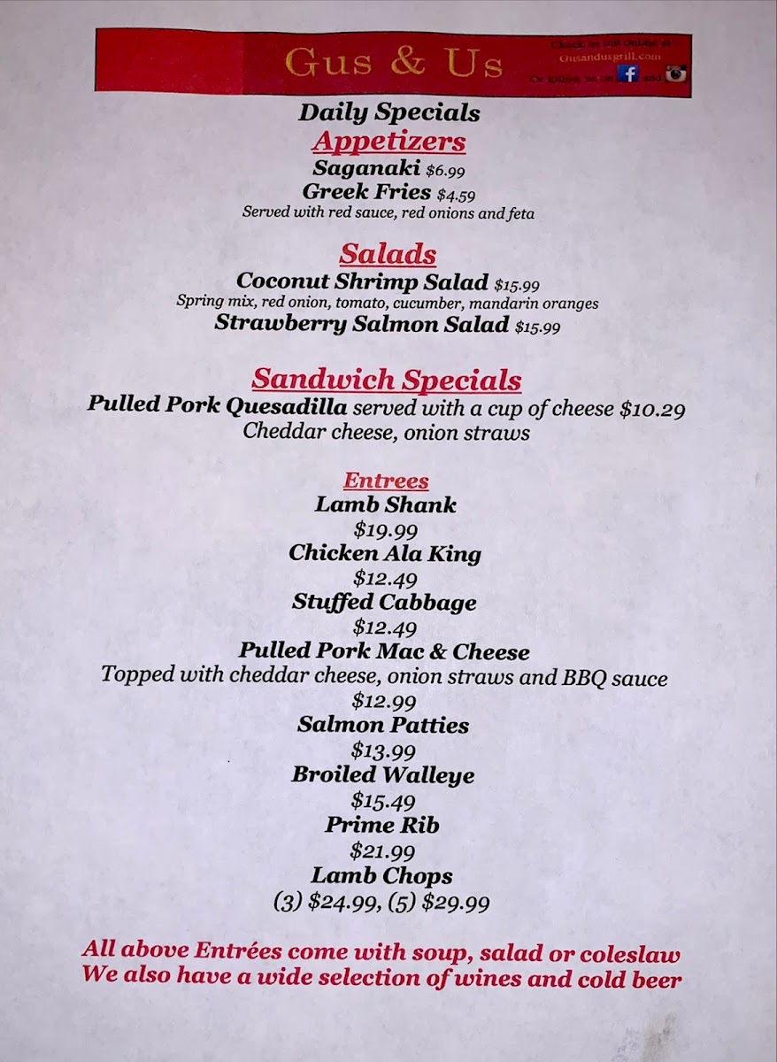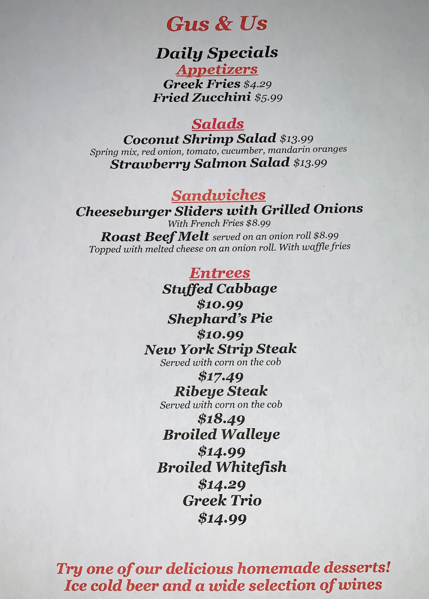 Welcome to Gus & Us Grill, a delightful culinary haven located at 17445 Hamilton Ave, Allen Park, MI. Known for its warm atmosphere reminiscent of the '70s, this charming spot has quickly become a beloved staple for locals and visitors alike. The menu offers a rich tapestry of flavors, featuring delicious omelettes such as the Ham & Cheese and Spinach & Feta, both artfully prepared and generously portioned. Breakfast enthusiasts will relish the Cinnamon Roll and Gyro Meat, ideal for a hearty start to your day.